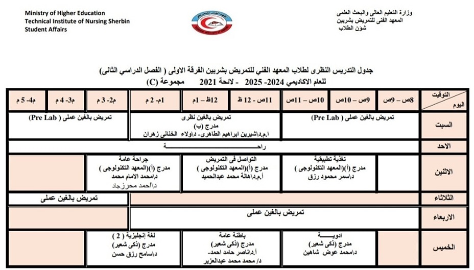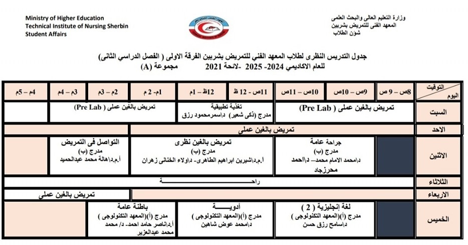 الجدول الدراسى لطلاب الفرقة الاولى بالفصل الدراسي الثاني من العام الأكاديمي ٢٠٢٥/٢٠٢٤